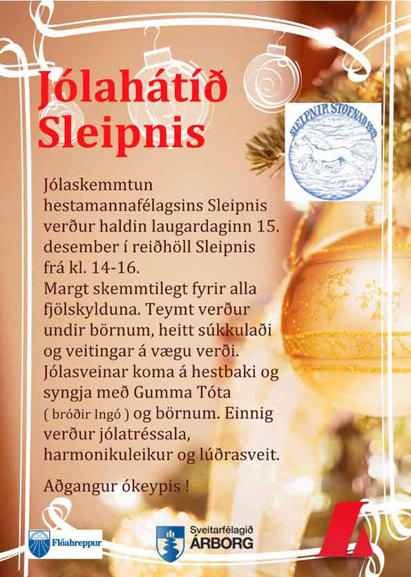 Jólahátíð Sleipnis verður í reiðhöllinni nk. laugardag og stendur frá kl. 14-16.
