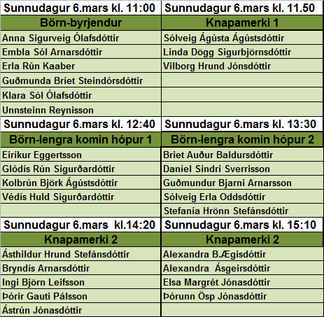Vegna þess að tímar féllu niður sl. þriðjudag hefur verið ákveðið að hafa aukatíma í reiðhölllinni sunnudaginn 6.mars, sjá tímatöflu hér að neðan.