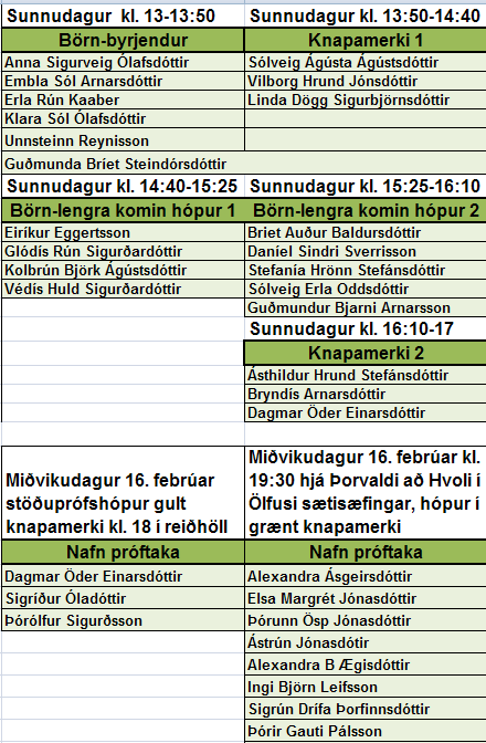 Aukatímar verða haldnir sunnudaginn 13. febrúar til að bæta upp tímana sem féllu niður vegna veðurs sl. þriðjudag, sjá tímatöflu hér fyrir neðan. Hópur sem fer í stöðupróf í gulu knapamerki þarf að mæta í annan undirbúningstíma næsta miðvikudag 16. febrúar kl. 18 í reiðhöllina, sjá tímatöflu. Hópur sem fer í stöðupróf í grænu knapamerki þarf að mæta næsta miðvikudag 16. febrúar kl. 19:30 að Hvoli í Ölfusi þar sem Þorvaldur býr, athugið að mæta án hesta. Teknar verða fyrir sætisæfingar og verða hestar á staðnum.